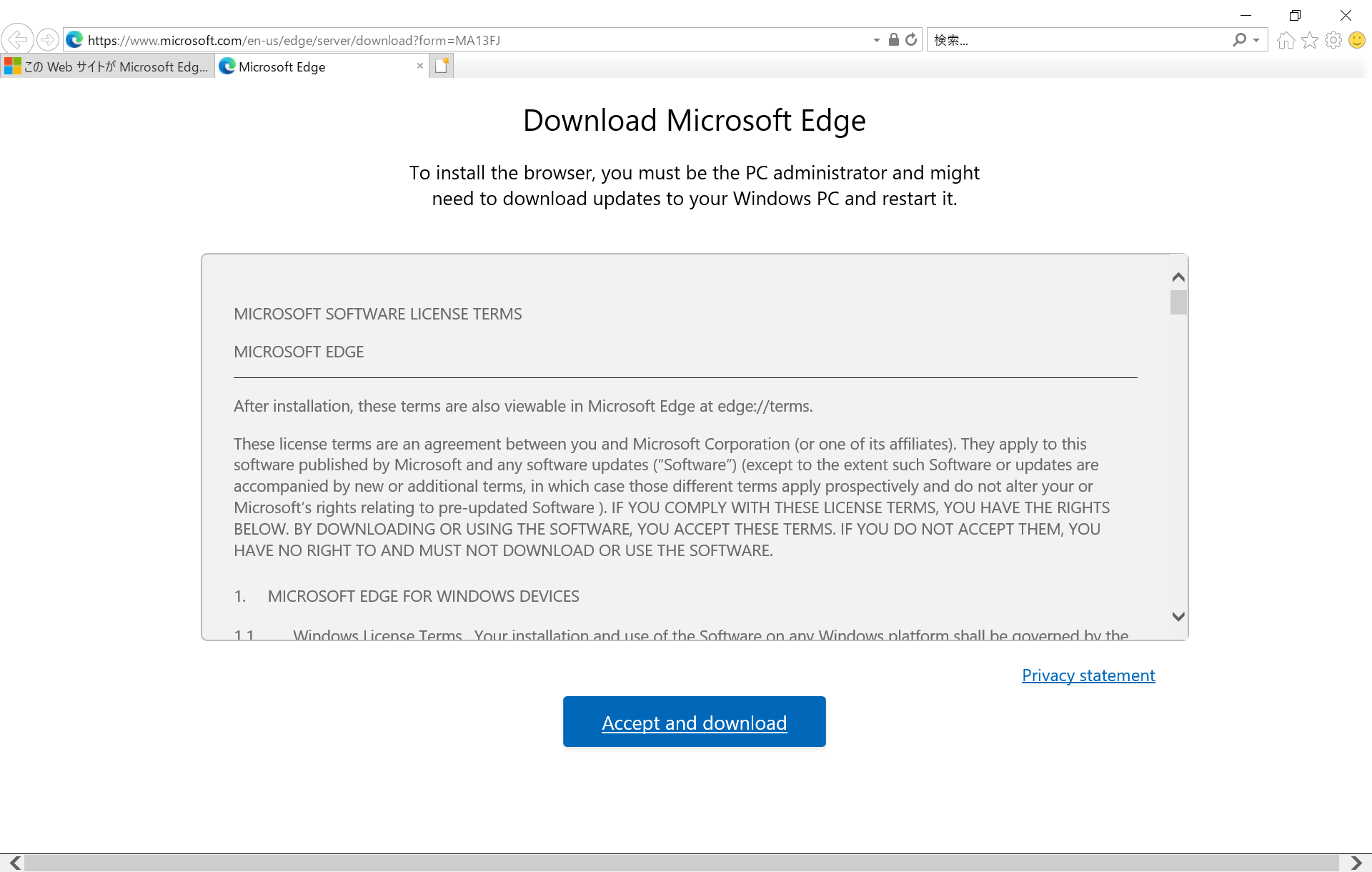 2023/2/15にWindows 10で起動したところ。Edgeのダウンロードを促される。