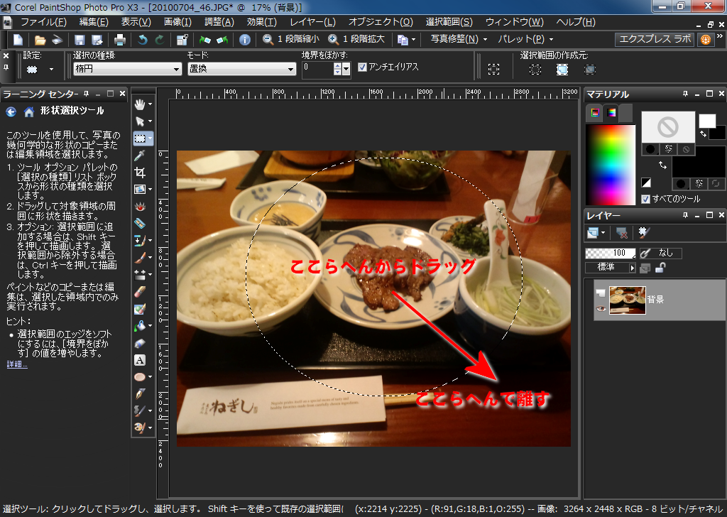 3:円の中心部から外側に向かってドラッグして選択範囲を作ります。