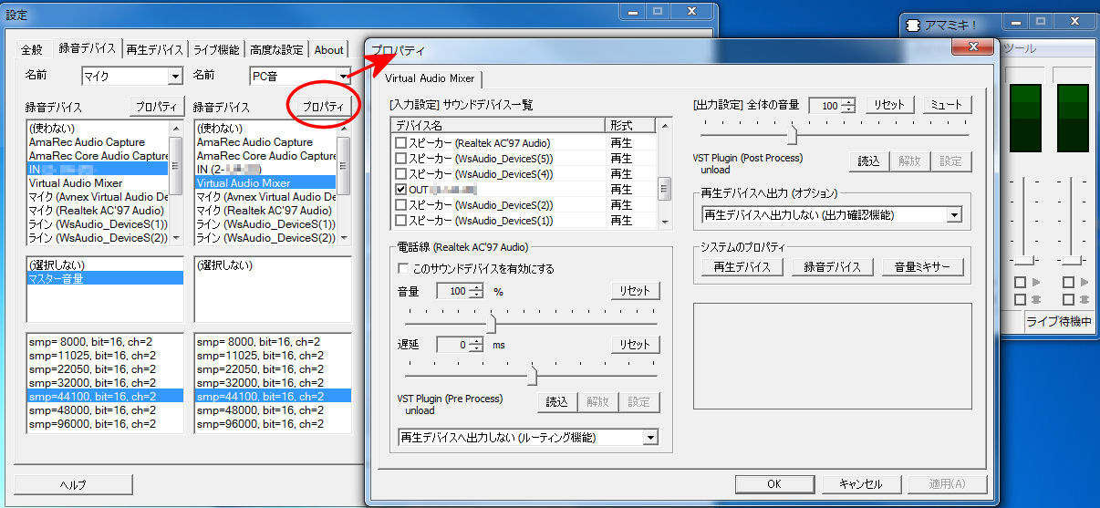 最初「猿ちぃ」をつかって配信を試みていたのですが、アマミキだとヘッドホンにながれている音もちゃんと放送に載って、ラグが激減!ウハウハ!