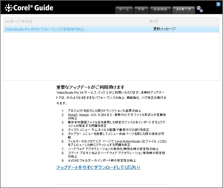 VideoStudio Pro X4 サービス パック 2 がご利用いただけます。本無料アップデートでは、次のようなさまざまなパフォーマンスの向上、機能強化、バグ修正が実行されます。